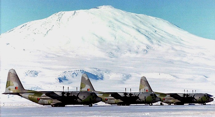 RNZAF C130's at the ice runway, McMurdo 1990 - Mt Erebus in the background