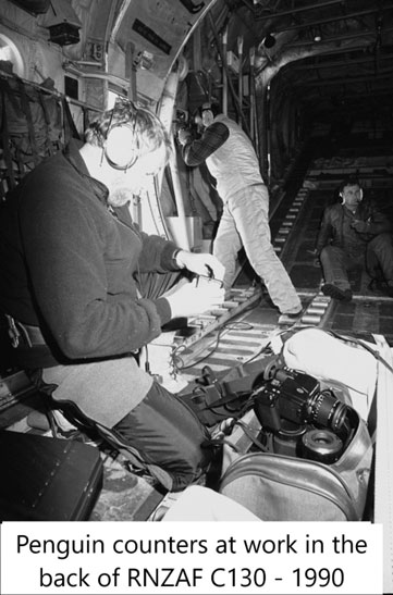 Counting Penguins: Penguin populations at several coastal colonies were counted using aerial reconnaissance, with high resolution photos taken from the C130 para door then analysed back at the research centre to determine an accurate count of breeding pairs and establish annual population trends.