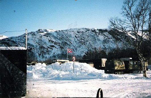 That year Christmas flew by and very quickly January arrived. I met up with the Advance Party at Lyneham and we deployed to Bergen on board C130 XV204 with 3 x Landrovers and trailers and then drove through some beautiful scenery to Voss. All the UK vehicles had studded tyres, which I discovered were not that clever and it was also the first time I encountered snow chains. Once outside of Bergen, all the roads had a surface consisting of at least a foot of ice. Throughout the whole deployment I decided to leave the driving to the professionals. As it was, I was to witness several bumps and scrapes before the exercise ended.