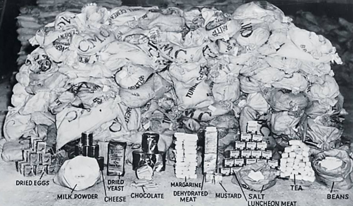 In late April and May 1945, as hostilities drew to a close, Bomber Command took part in two major relief operations; Operation Manna and Operation Exodus. In Operation Manna more than 6,600 tons of food were dropped to the starving population of the Netherlands. With no parachutes to slow their descent, supplies were released from just 400 feet. Alongside, the US Air Force's Operation Chowhound delivered more than 11,000 tons of food in ten days, saving countless lives.