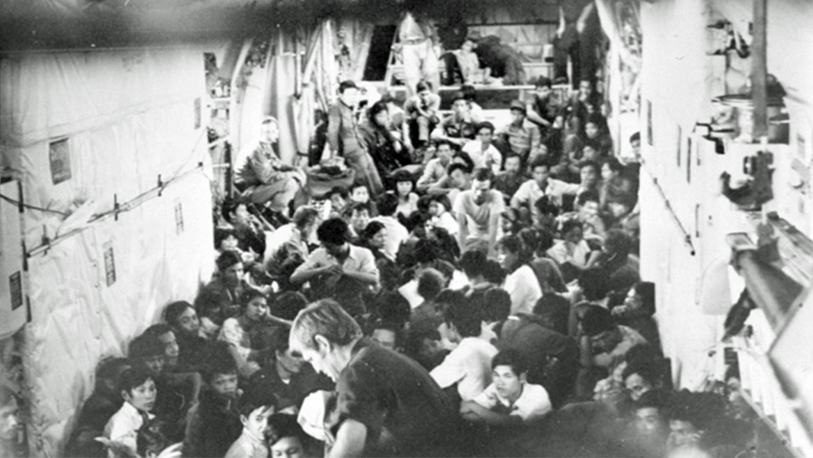 The cargo compartment of a 37SQN C-130A full of South Vietnamese refugees fleeing from the North Vietnamese army