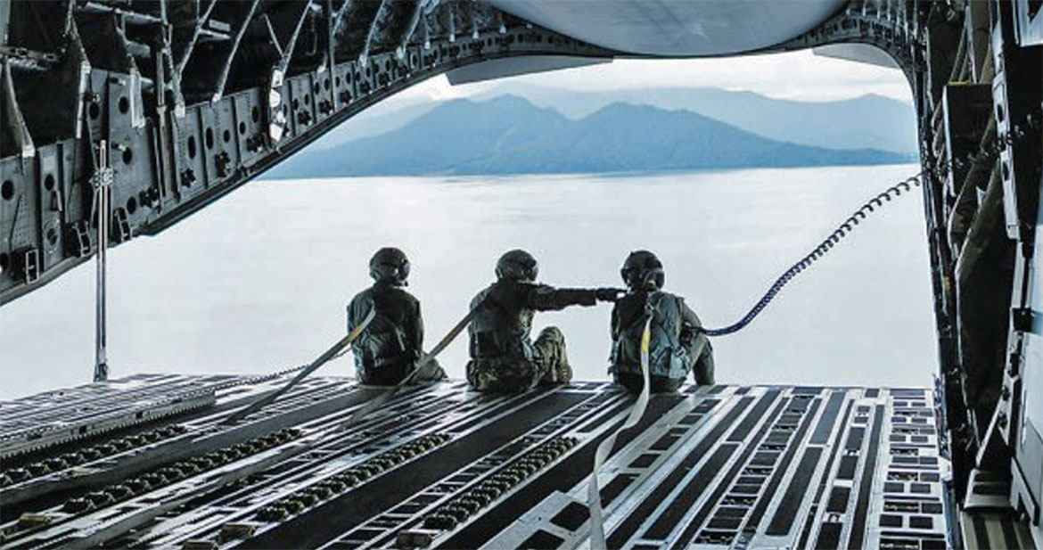 RAAF loadmasters FSGT Stephen Brooks and CPL Jake Willington, Pacific Air Forces (US) loadmaster Senior Airman Aniel Reina and RAF loadmaster SGT Iain Blears on a RAAF C-17A Globemaster III at RAAF Base Amberley during Exercise Global Dexterity 25-1.