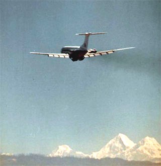 The onload next morning comprised new recruits and those returning after leave. The VC10 crew was accommodated with us in a large detached house on the edge of Kathmandu (appropriately called Britannia House). Because the same VC10 crews flew the tasks, we got to know them very well and it was a very close working relationship. So it was a highly professional and enjoyable 4 months. The VC10 was seldom late arriving and invariably departed on time after its night stop. I remember sending the TRANSDEP signal when the last of the 52 seasonal flights left, reminding them that all 52 flights had departed precisely on time at 1010 local (the nightly fog clearing almost to the minute at 0930). The VC10 always took off toward the Himalayas, providing a magnificent spectacle to the dozens of people who gathered to watch this noisy departure and the steep climb out towards the mountains.