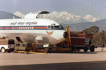 Off went Sgt Eddie Gordon and myself by BA to Hong Kong for a briefing before an enjoyable flight with Cathay to Bangkok and Royal Nepal Airlines from Bangkok to Kathmandu. Once again, after arriving in KTM, we had to construct the Britannia Freight-Lift Platform (Condec’s predecessor and a something of a temperamental beast) and prepare for 52 departures of what was now a PCF Boeing 727. I would be lying if I said it all went smoothly on this second detachment. Royal Nepal Airlines had acquired an already-aged 727 and there was no replacement aircraft if it went unserviceable. And the schedule was very different - it departed KTM in the evening and flew overnight to HKG.