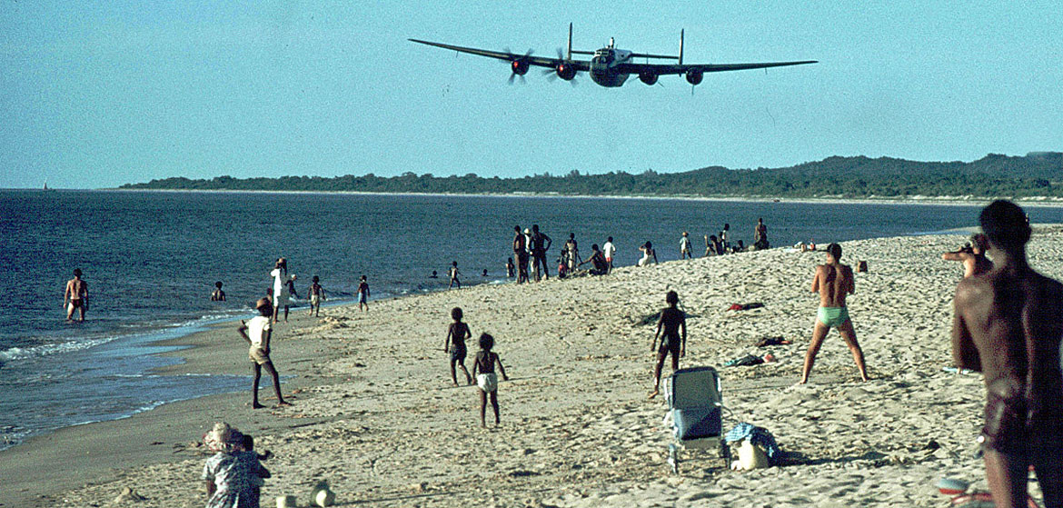 38 Squadron practicing low flying skills, note both port engines feathered! - Photo taken at Majunga in Madagascar in 1966
