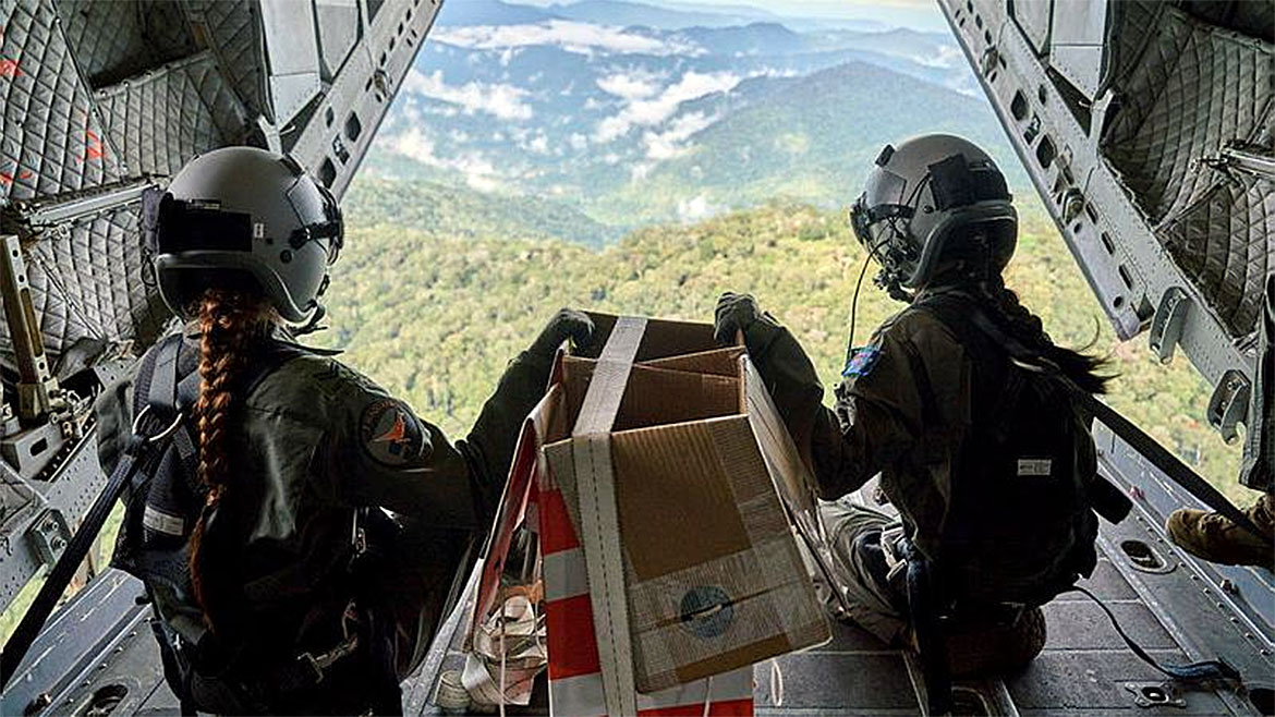 Detachment commander Flight Lieutenant James Champness said CONAD is one of many capabilities of the C-27J. “This was an example of how 35 Squadron, building from our knowledge and experience operating within the mountains of Papua New Guinea, can effect an airdrop to an unsurveyed drop zone 5000ft up in the mountains,” Flight Lieutenant Champness said. “Whether it’s the ops team planning the broader schedules and timings, or the movers organising the load, or finally the pilots and loadmasters who thread the needle on time and on target, everyone plays a crucial role in getting the supplies where they need to be, intact.”