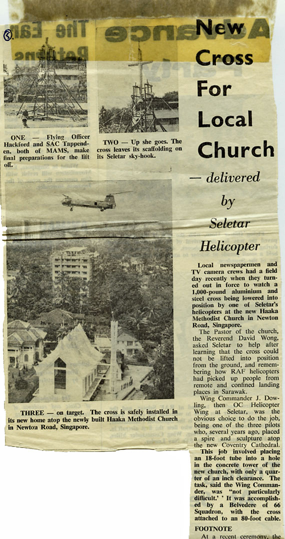 One of the most satisfying tasks given to me was to rig a cross that was to be lifted onto the Hakka Methodist Church in Singapore.