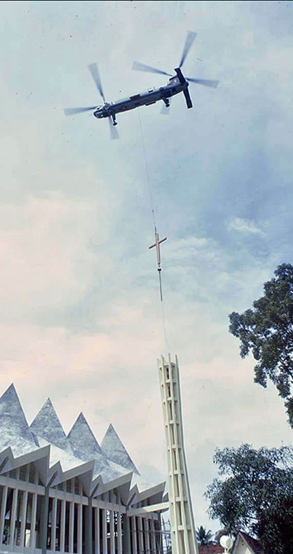 A Royal Air Force (RAF) helicopter, lowering and positioning the 1,000kg aluminium cross of the new Hakka Methodist Church in Newton. The precision exercise was undertaken by a Belvedere helicopter of the 66th Squadron, RAF Seletar on Dec 15, 1966.