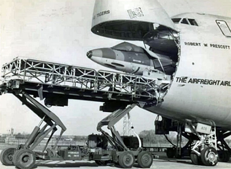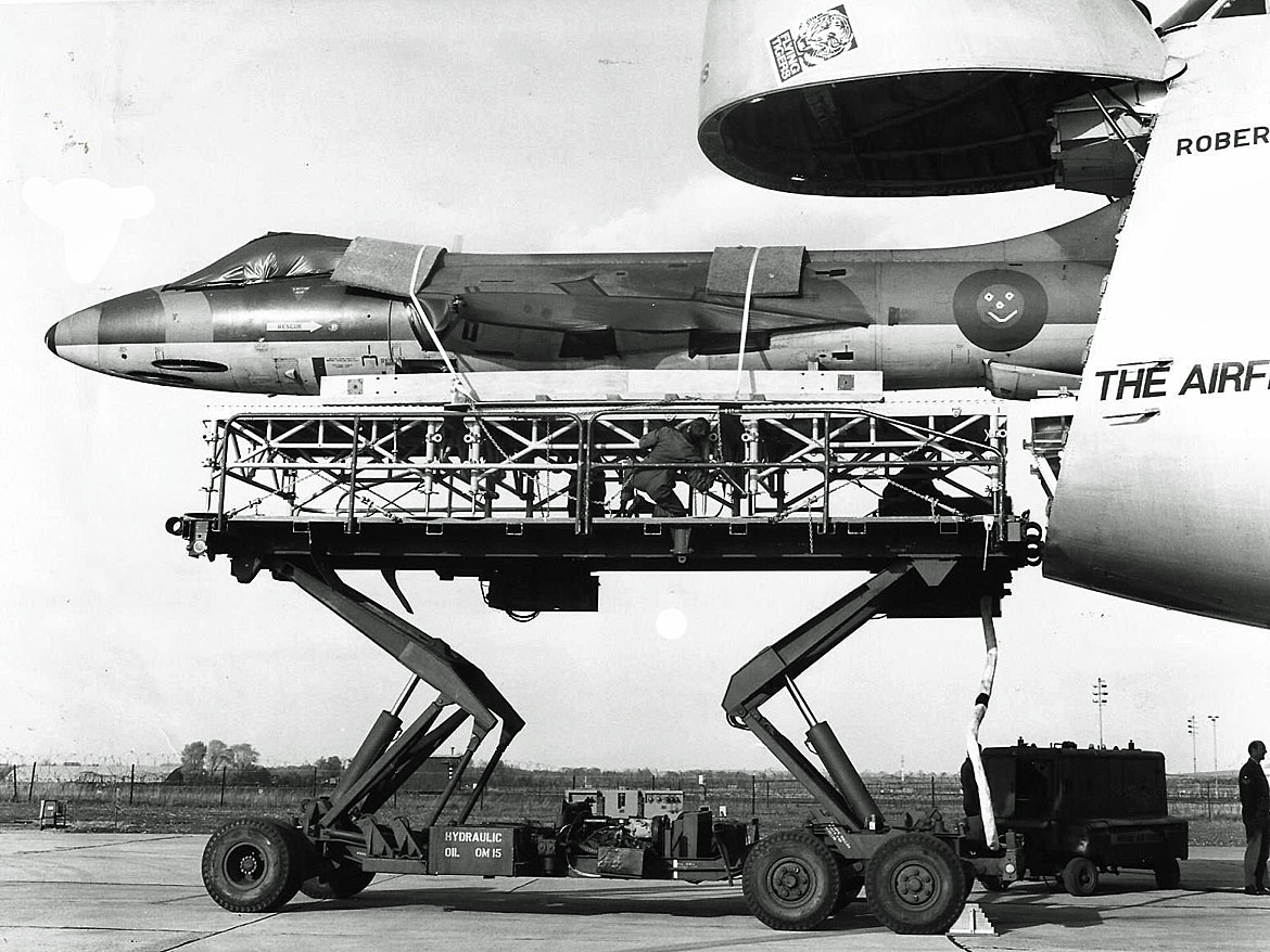 The final picture was taken at Brize Norton in 1983. As a thank you to President Pinochet of Chile, for his support during the Falklands War, we donated to Chile several Hunter FGA aircraft. These were the days before the RAF had or operated any widebody aircraft and the ground support equipment reflected that. Several B747 freighters arrived at Brize to collect the aircraft. Using a 25k Condec with a max height of 12ft, How to you "bridge the gap?" The solution is shown and with the use of Anthony Allen Docking on top of the Condec, all worked a treat.