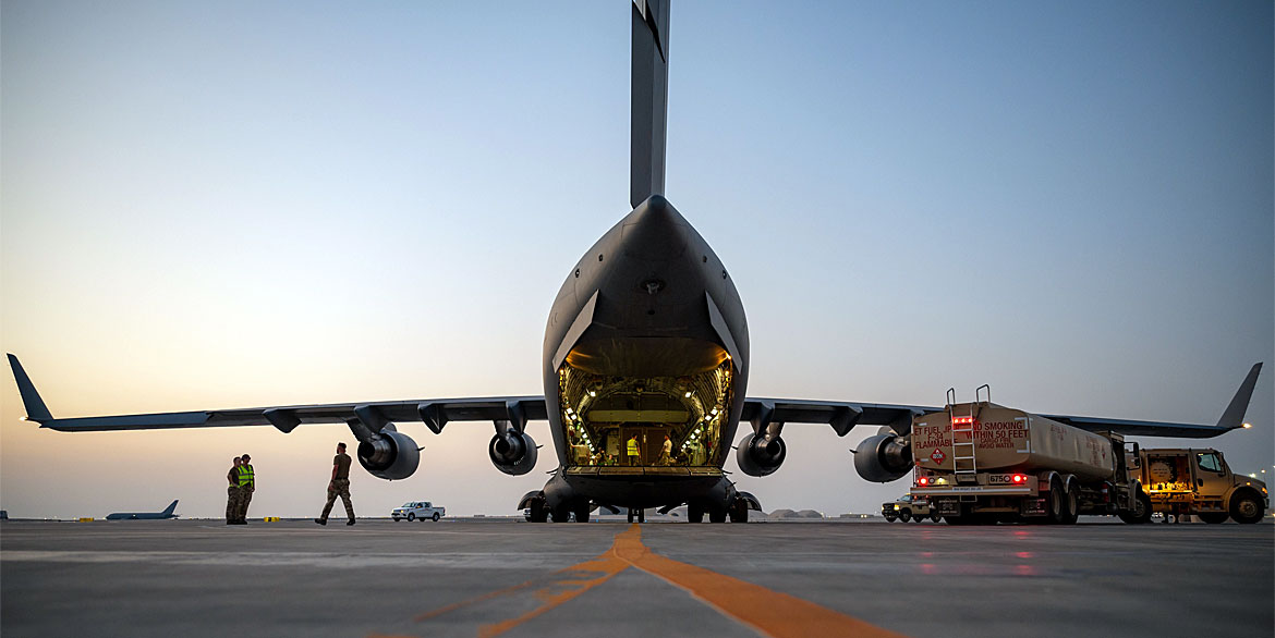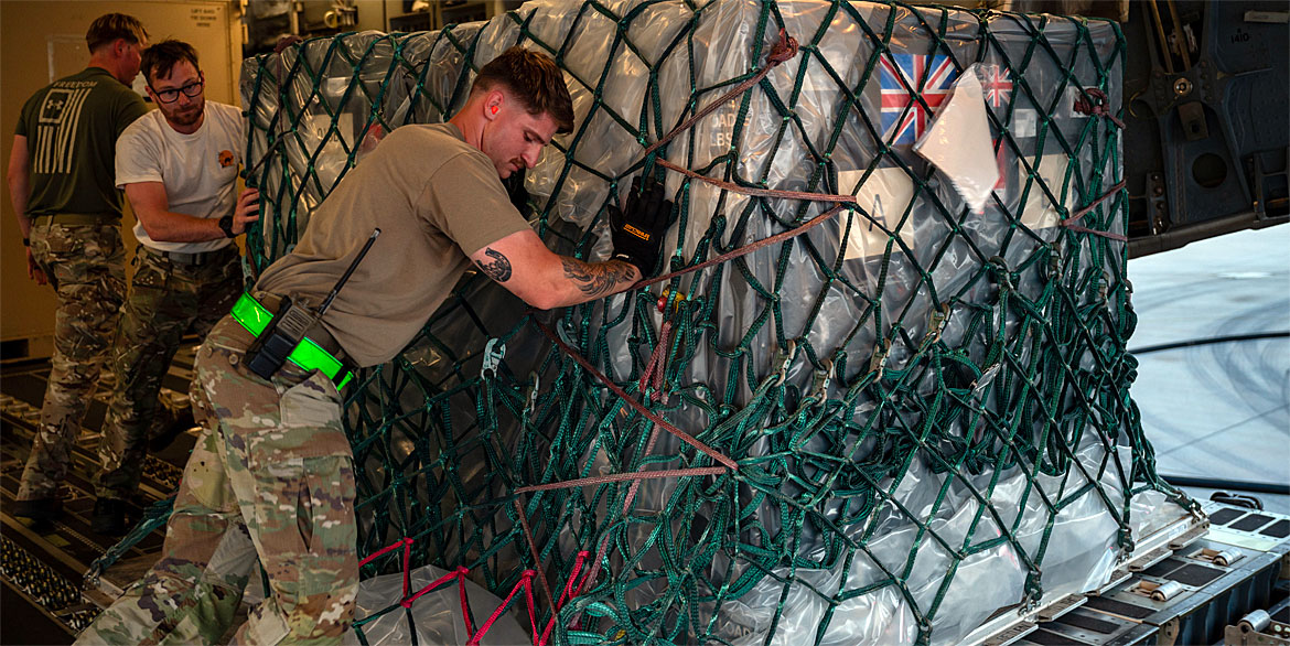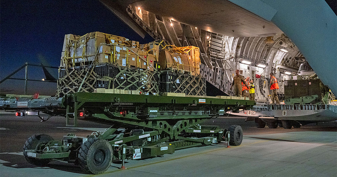 As part of this airlift, RAF movements personnel were joined by US Air Force personnel from the 379th Air Expeditionary Wing, to unload and refuel the aircraft in a demonstration of combined interoperability.