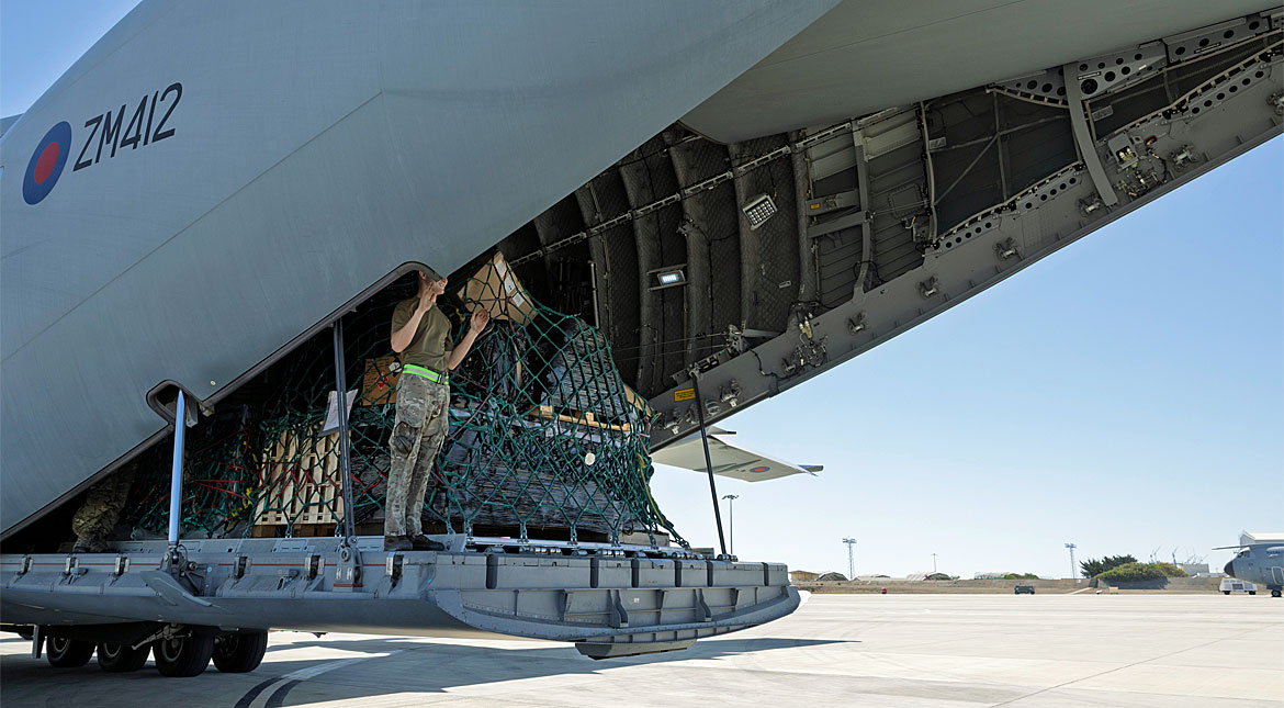 MITS flights set off from RAF Akrotiri, where the aircraft is prepared for its sortie. Refuelling is carried out by the locally based Airfield Support Squadron, freight pallets are then loaded by a combined team of Movers drawn from the Joint Movements Squadron and deployed personnel from the UK Mobile Air Movements Squadron (UKMAMS).