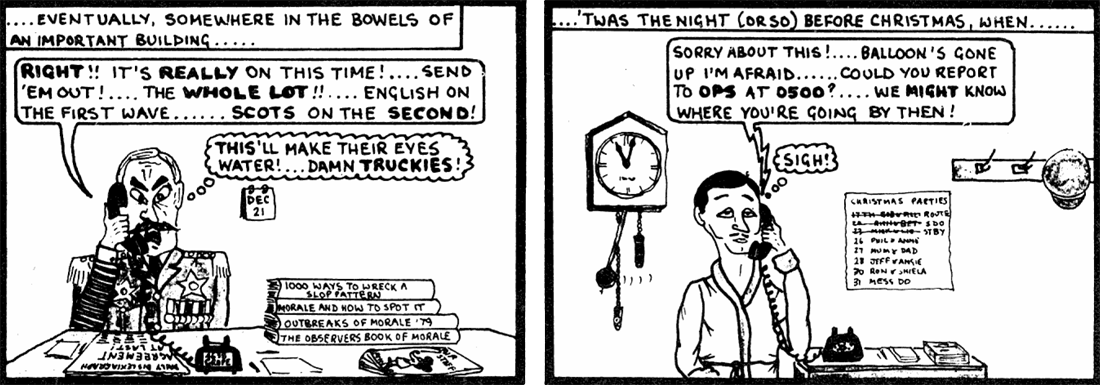 How the hell were we going to offload these tracked vehicles? Jim had found on his wanderings a stack of timber which we then relocated and placed as a ramp beneath the ISOs. It worked a treat, but by the end quite a lot of the wood was splintered and trashed. Sometime later that morning, we were advised to "keep a low profile" as the RSM of the Royal Irish Rangers was on the warpath. The timber we had found was in fact his dismantled dais, used for VIPs to take the salute on parades!