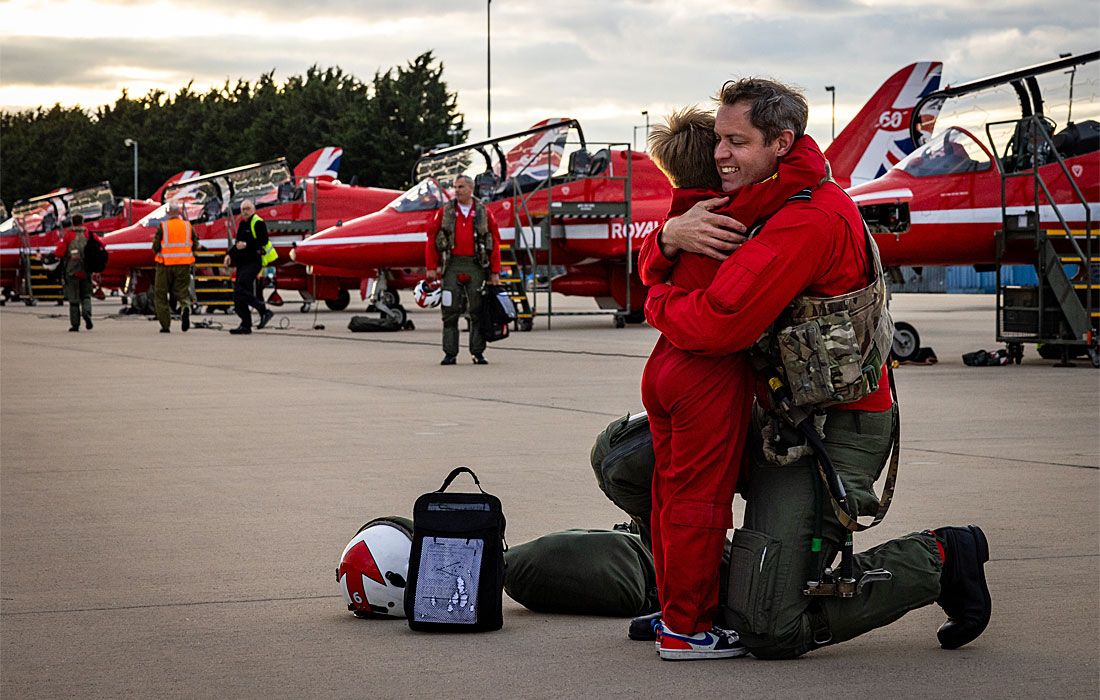 The Red Arrows are welcomed by families after returning to RAF Waddington from Canada