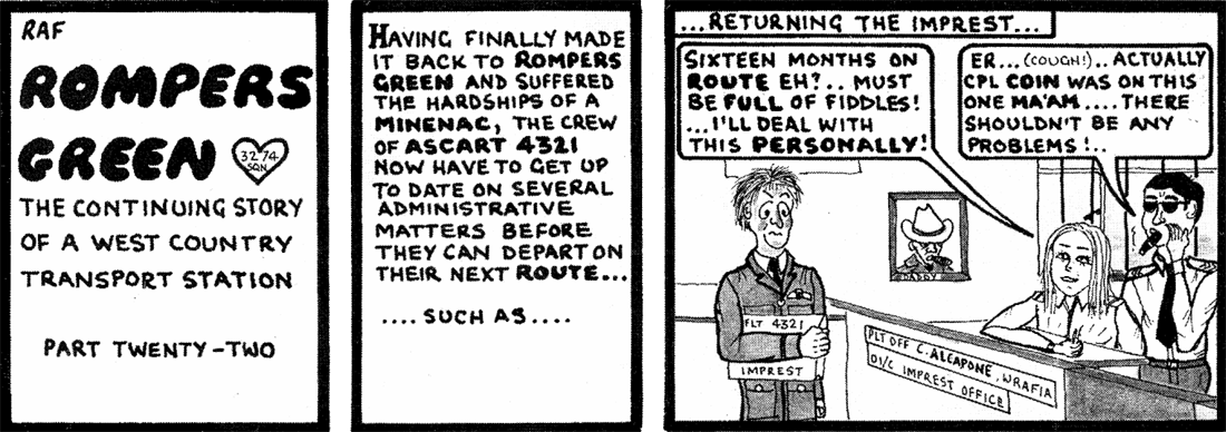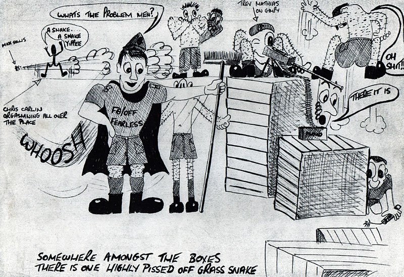 The snake cartoon is me as Fg Off Fearless when my movers found a live snake in palletised freight we left on stillage overnight to be loaded on a Herc the next morning. They were all too scared to tackle it, so armed with a broom and machete I took it on. It wasn't a grass snake but it wasn't much bigger. I winged it with the machete and it disappeared never to be seen again.
