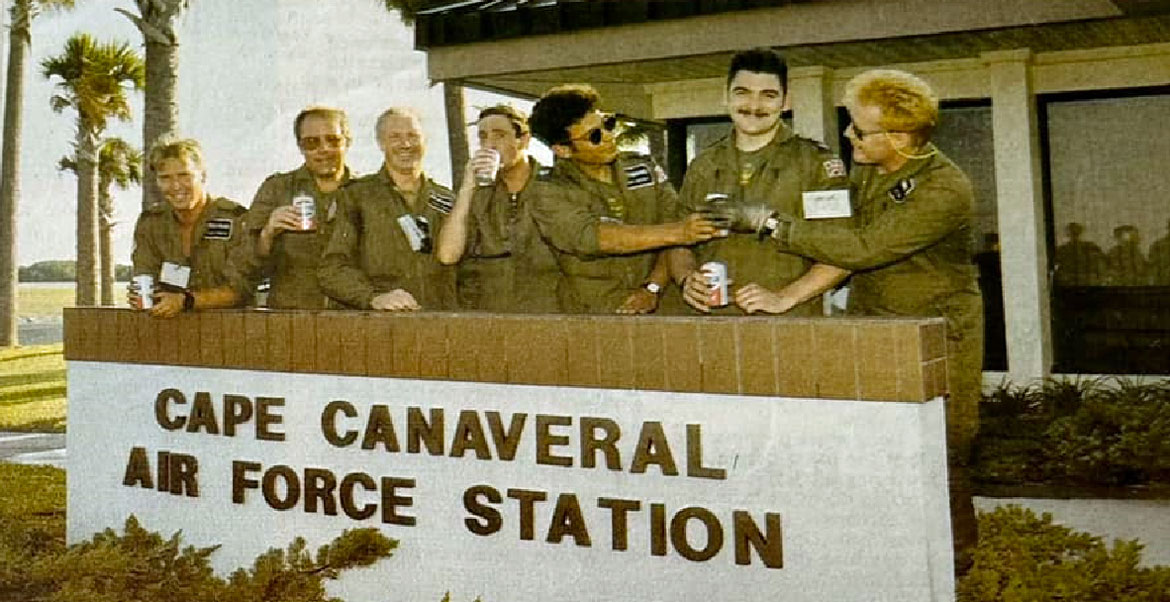 UKMAMS team take a break for a refreshing drink at Canaveral: (L to R) Flt Lt Simon Hawkins, Sgt Clive Bishop, Sgt Colin Hawson, Cpl Steve Burke, Cpl Mick Gidney, Cpl Dave Swetman and SAC "Flash" O'Neil