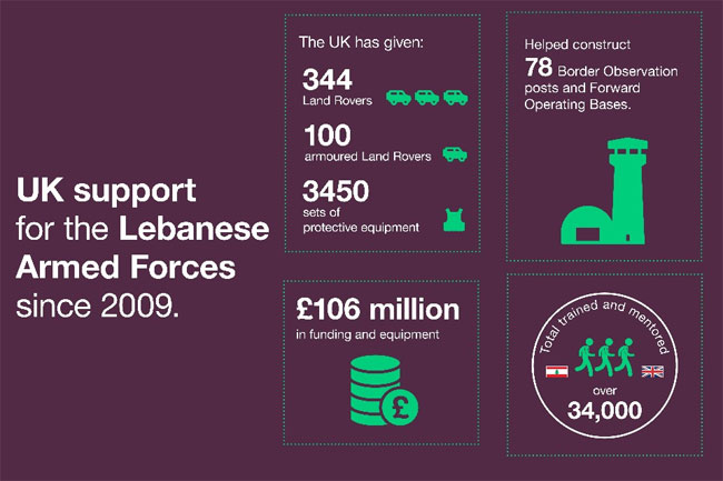 For more than a decade, the UK has given critical support to the LAF as a trusted partner, through training, mentoring and the provision of equipment. Since 2009, the UK has trained over 34,000 LAF personnel and dedicated over £106 million in funding The UK has also helped to construct nearly 80 Border Observation posts and Forward Operating Bases as part of efforts to support Lebanese border security.