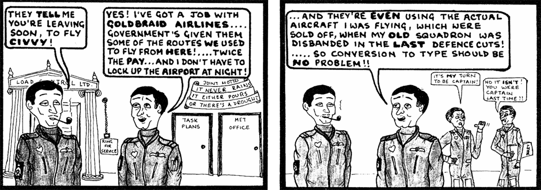 Dealing with the party first, along with a dozen or so Flight Lieutenants and Squadron Leaders, I waited from about 6pm for a briefing and then to meet the honoured guests in the entrance to the impressive and imposing Mess. I had been allocated a name which meant nothing to me and, of course, no Google in those days to help find out more. Time went on and one by one my fellow hosts met their guests and went on to join the long line to be welcomed by the AOC and his wife. Soon I was on my own. At 7 pm I gave up and headed into the Reception and, no longer having to "host", got stuck into the G & T's at a most enjoyable party. By about 9 pm, the AOC had gone and we were down into a small circle of about a dozen going for one (at least) last drink. I found myself standing beside a chap who looked to be in his fifties. Assuming he was also on the AOC's staff, I introduced myself only to hear coming back at me the name of the chap I was supposed to be hosting. When I jocularly claimed, emboldened by half a dozen G & T's, that I had waited all night for him, with a twinkle in his eye, he explained: "Laddie, I have been coming to these "dos" for years. Early on I realised that if you come in through the kitchens, you can bypass all this waiting in line to greet the AOC and get stuck into the party straight away". I learned something from that - not entirely sure what.