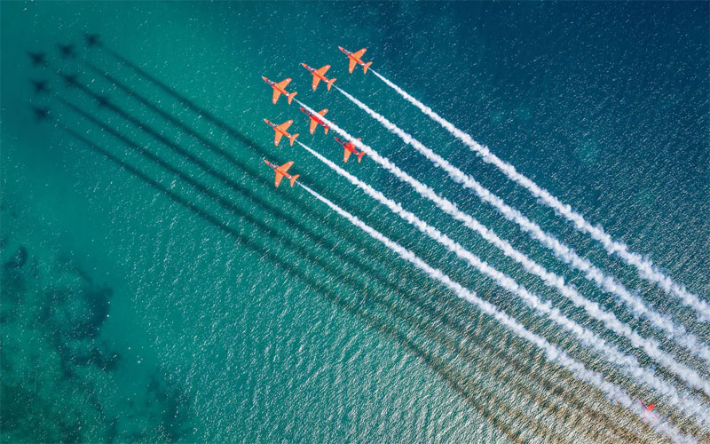 Flying Above the Sea Hawk T1 aircraft of the Red Arrows, over the water during a display practice in Greece