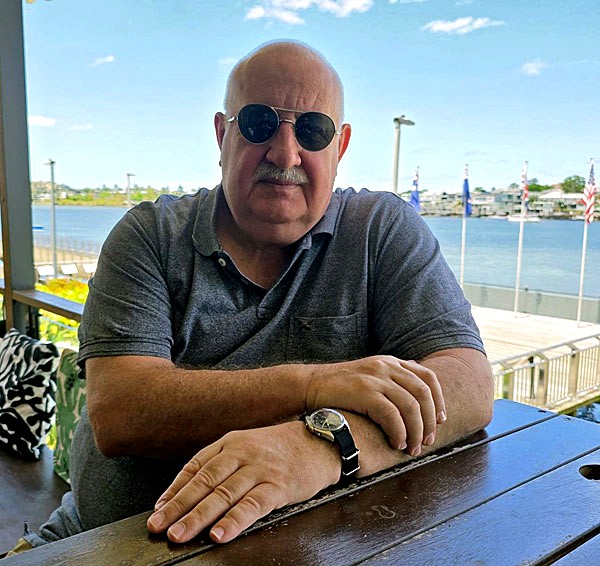 The photo of myself at right was taken recently at our favourite local cafe on the Brisbane River, next to the "Submariners Walk", as mentioned in a previous epistles, hence the allied flags in the background.