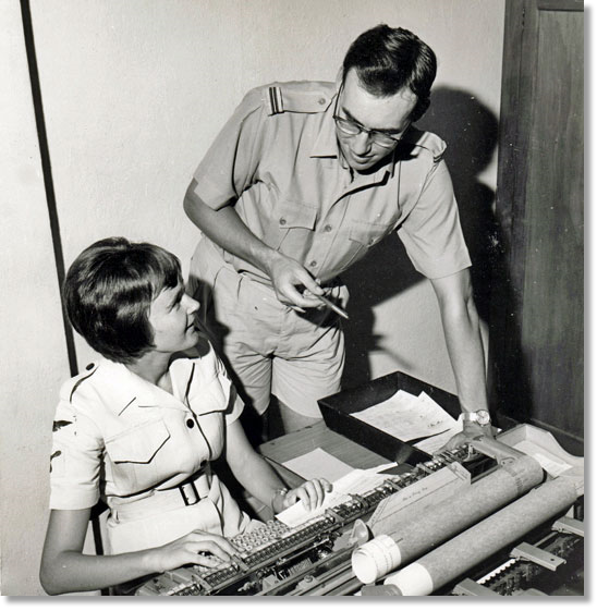 DP acting OC SCAF Changi. If you look carefully you can still see the soap bubbles behind the ears. Taken in October or November 1964, having been in post for just 2 or 3 months. With SACW Lyn Hibbard, she is the one sitting down. Lyn is explaining that it is not a very large cigarette rolling machine but the latest in logistics (sorry equipment branch) technology.