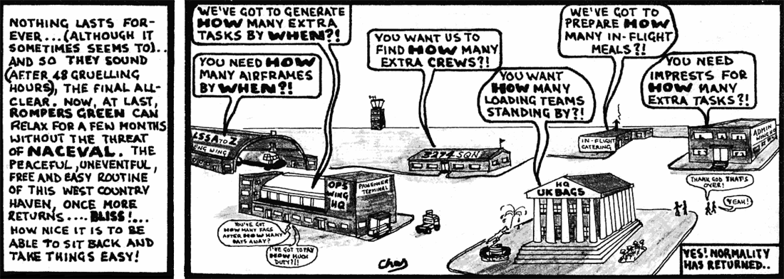 Apart from the movements work on VC10, Hercs and Belfast, we worked with the “new” Tristar fleet crewed by a mix of RAF & BA crews. On these troop roulements the RAF auxiliary movers came from UK to give us a hand. These guys were pretty good at building baggage stacks in cargo nets for the Wessex to take to awaiting passenger ships such as Uganda.