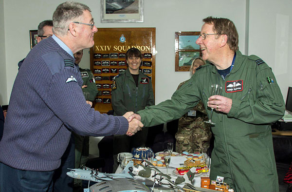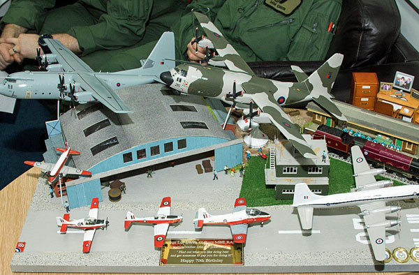 Flight Lieutenant Derek Oldham, a RAF C-130 pilot, based at RAF Brize Norton turned 70 years old on the 16th of this month. With over 51 years of service in the Royal Air Force he is breaking all known records! Derek, who is a No. 622 Squadron Reservist, still instructs in the C130 simulator on No. 24 Squadron and is always on hand to offer assistance, drawn from encyclopaedic knowledge of his subject and extensive experience. The amazing model (pictured), is a 3D ‘This is Your Life’ and has all the aircraft he has flown as well as his football team Manchester City, an airdrop during Ethiopian famine, his trainspotting youth, his dog and some family photos on his desk. Happy Birthday to an exceptional RAF Ambassador!