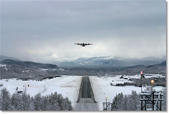 Chains back on and off we went to the find the correct airfield. Sure enough there was a reception committee waiting for us on the tarmac. There was also an enormous forklift with a boom about 30 ft high with tines wide enough to pick up your average 3-tonner. It was apparently used in oil pipe laying. Having consulted with the Norwegian powers that be, this was their total asset available to effect the offload. Needless to say we wouldn't let the forklift come within 20 metres of the aircraft as it was absolutely useless. The Captain, now quite exasperated, was back onto HQ38 Group to report the problem and told them it looked likely that he would be bringing the mast back to the UK as there was nothing suitable to offload it, i.e. no transfer loader or Condec equivalent. He said he would have a chat to the UKMAMS team on board for any suggestions.