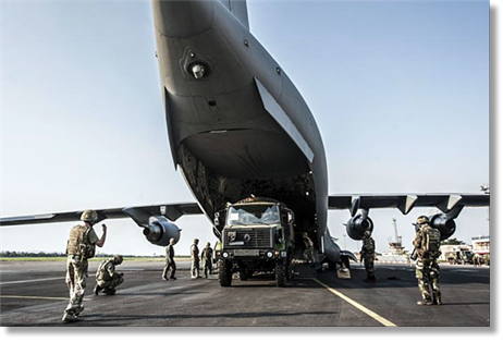RAF Movements staff and French Troops unload vital Military equipment from the back of a 99 Sqn C17 on its arrival at Bangui Airport in the Central African Republic on the 11th of December 2013.