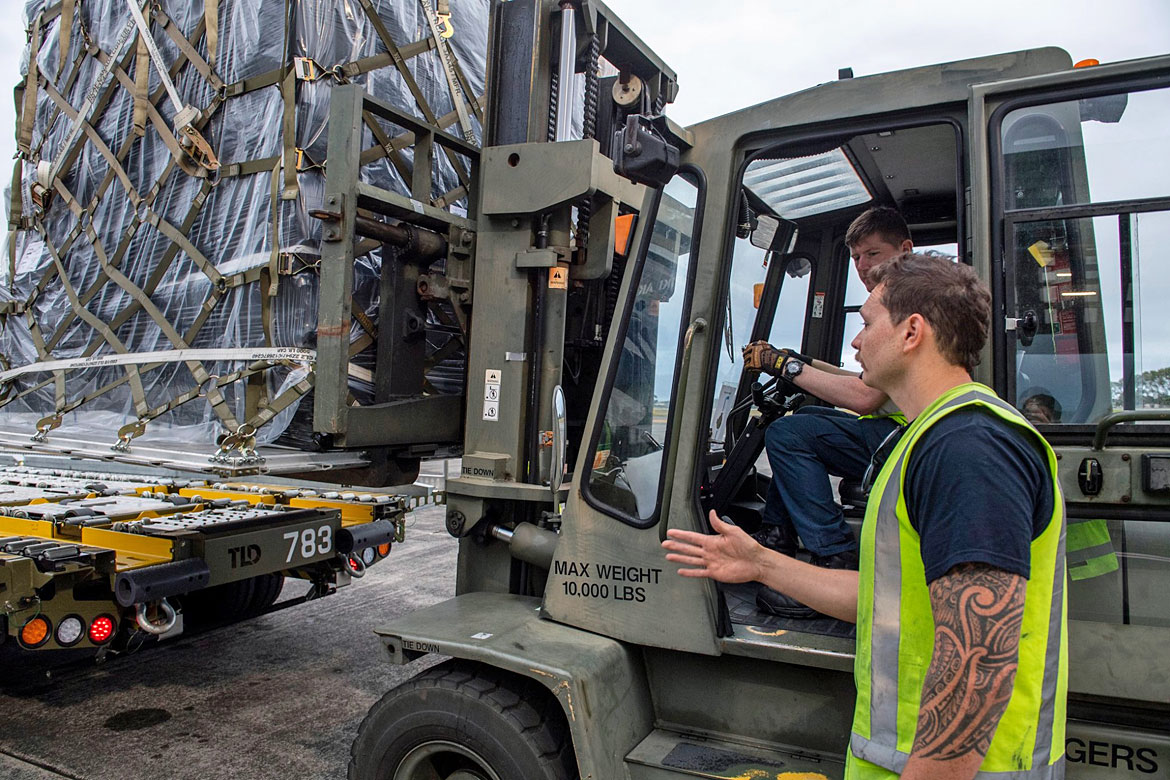 Contingency response personnel from the Royal Australian Air Force, United States Air Force and Japan Air Self-Defense Force unload plant equipment from a US Air Force C-130 aircraft at Northwest Field during the humanitarian assistance and disaster relief phase of Exercise Cope North 21 in Guam.
