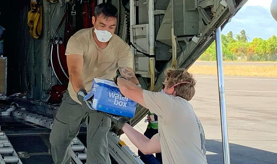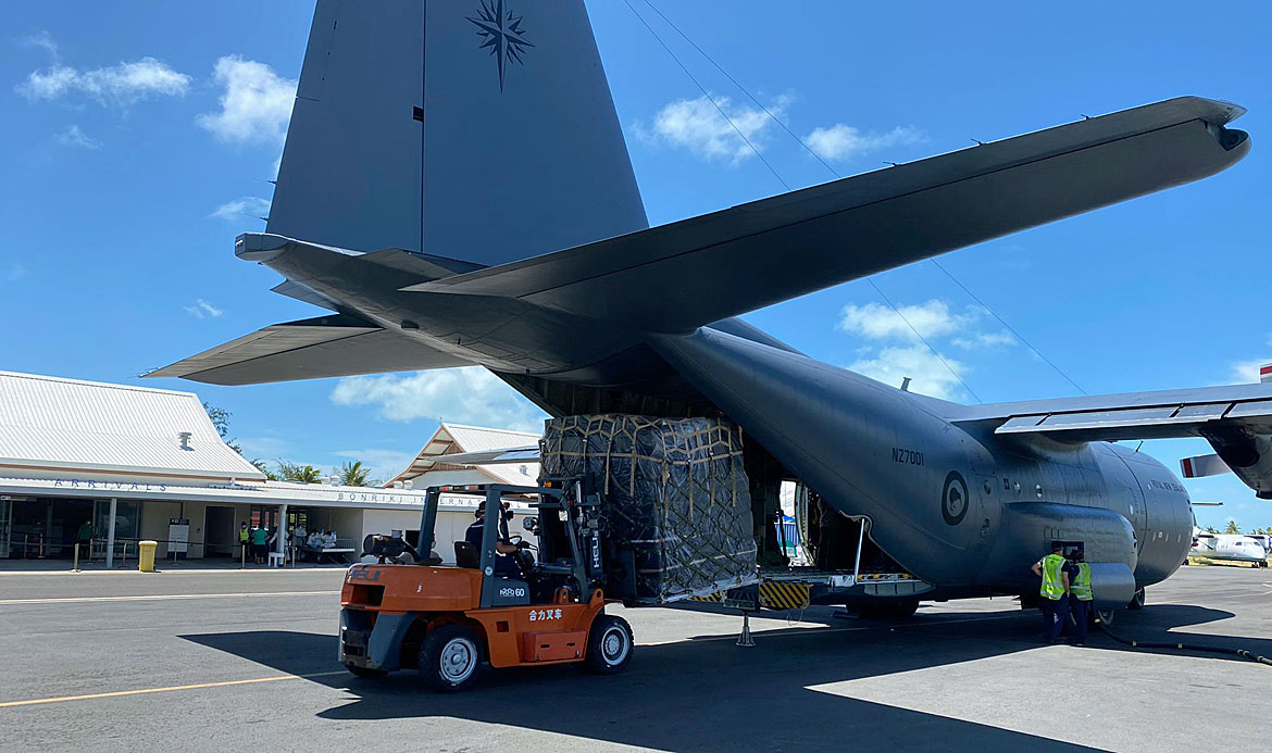 17 February, 2022. One of our Hercules aircraft and crew from No. 40 Squadron delivered more than 13,000kg of cargo to Kiribati this week. The cargo included Personal Protective Equipment, medical equipment, a generator and water. Most of the cargo was for the Kiribati Ministry of Health and Medical Services (MHMS).