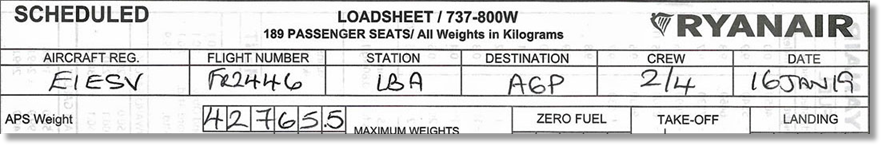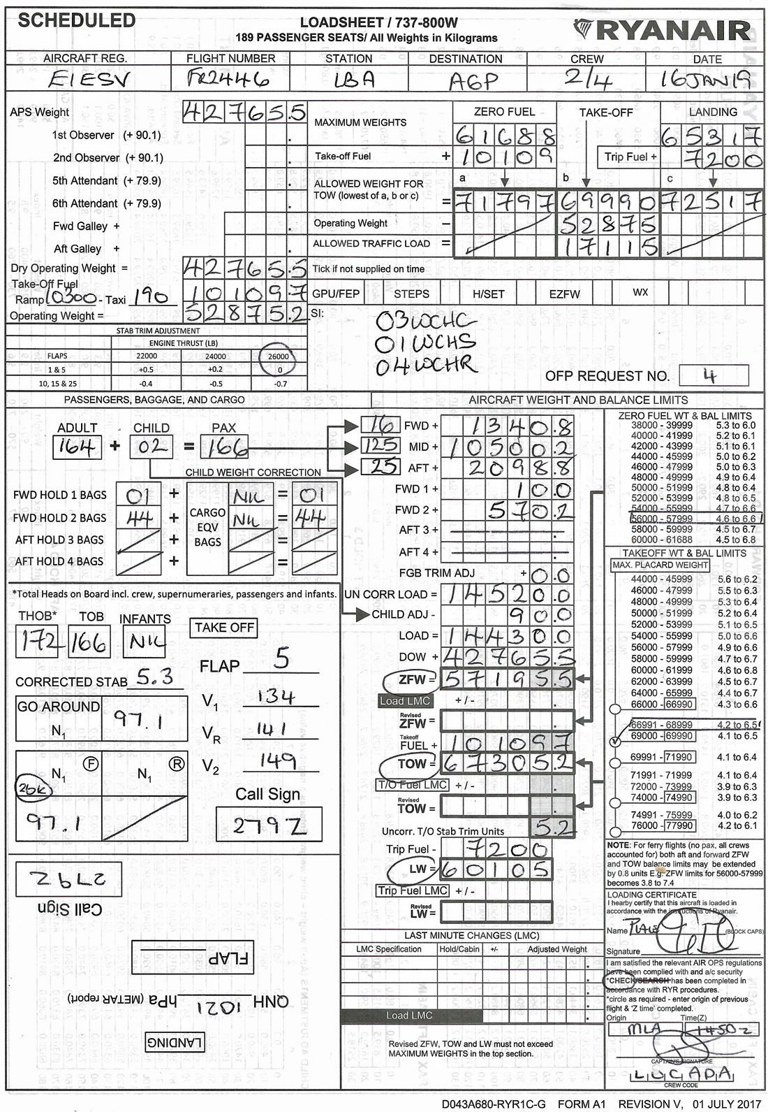 I have attached a Ryanair load sheet, which works on a digital format. Ryanair don't use them nowadays as the Boeing 738 has its own computerised weight and balance system which the crew complete themselves. It's a shame as it kept our minds active, especially when we had a lot of pressure with just 25 minutes for a RYR turnaround.