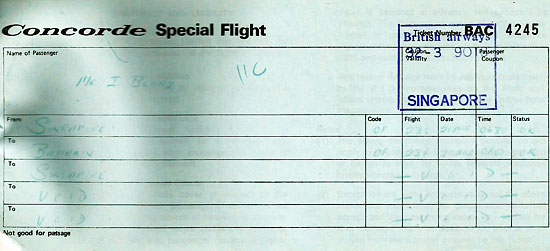 To this end 20 passengers were carried on each flight to act as “guinea pigs!” We had heard that a few RAF servicemen from RAF Tengah had actually flown on Concorde under this guise. Somewhat rattled I contacted Mike Kincaid of British Airways who was the Far East Station Manager and politely suggested as I/We put a lot of business their way why weren’t we considered for a flight? As easy as that our office were allocated two seats.