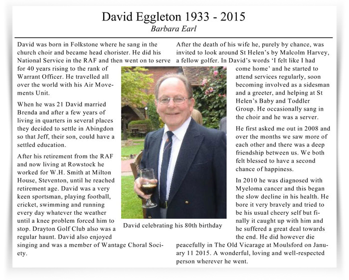 There is a short article on Dave Egg, with a photo, in the Abingdon St Helen’s Church magazine. It's by his friend and companion, Barbara Earl.