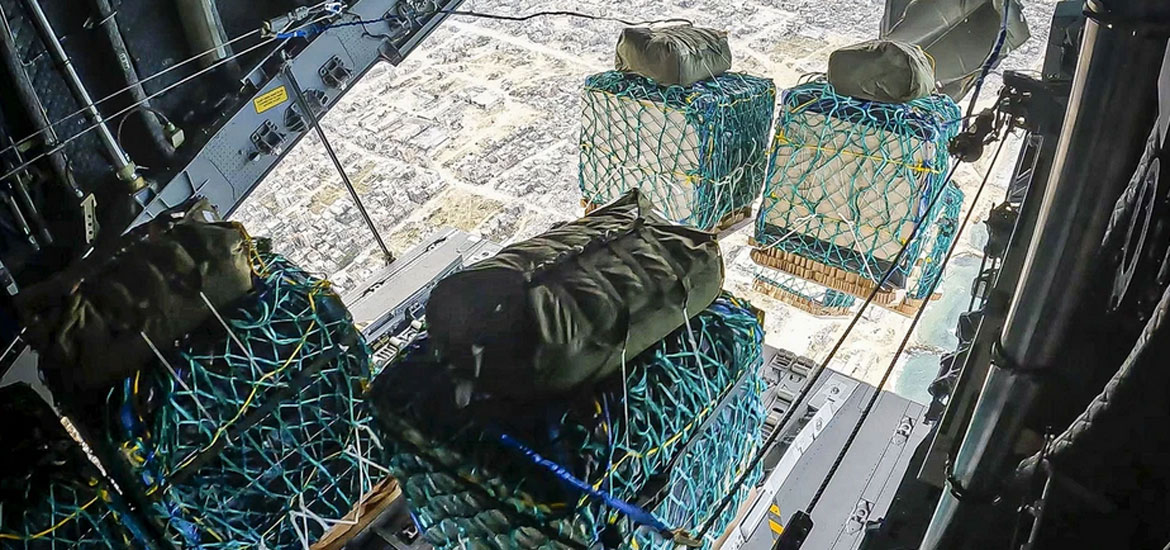The UK has launched an airdrop of vital aid supplies into Gaza for the first time, as part of international efforts to provide life-saving assistance to civilians. More than 10 tonnes of food supplies were dropped by a Royal Air Force transport aircraft over the enclave on Monday. The aid, which included water, rice, cooking oil, flour, tinned goods and baby formula, was parachuted above a prearranged landing zone.