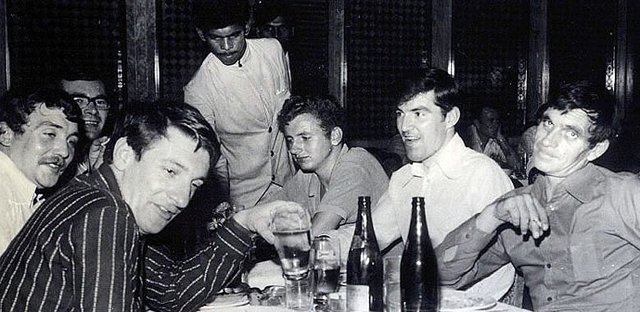 Later that evening we wandered into the bar of the hotel where, to our great surprise (!), about 9 people, the males with short hair, were together in a protective armadillo-like huddle sharing a shandy and one bowl of nuts. Not to miss the opportunity, I interrupted the group and said, "You must be from that U/S VC10". One or two grinned (I did know some of the crew) while others seemed surprised that I had guessed.