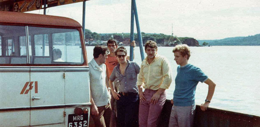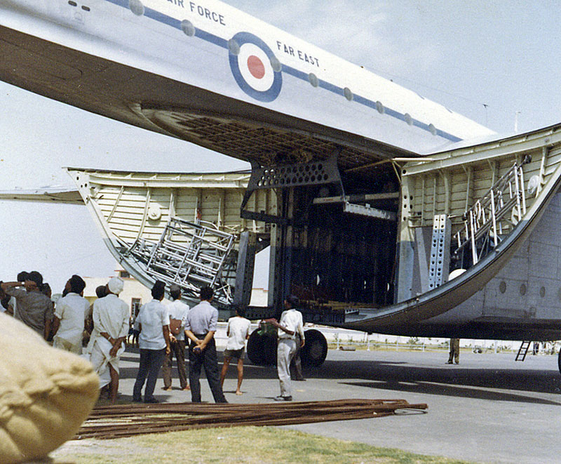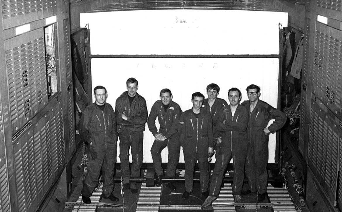 24th March 1973 - We had just loaded the Sabre jet flight simulator bound for the Indonesian Air Force. The team: Bryan Morgan (OC UKMAMS) N/K (Ground Engineer) Chris Twyman, George Lynes, Tony Gale, Tony Moore and John Evans.