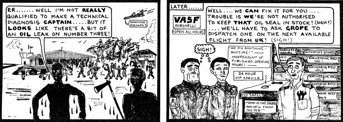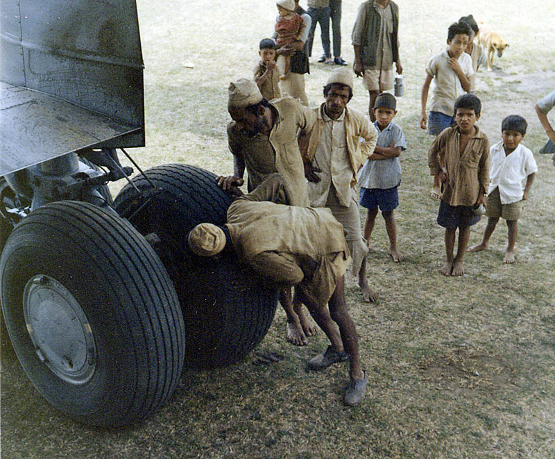 SACRAMENTO: Techies examine engine and declare an engine change is needed. Somewhere in the UK a plot is hatched to load a fresh Conway plus engine change kit onto a C130 already scheduled to go to the US. Engine gets trucked to Lyneham is loaded onto C130 which flogs across the pond and lands, broken, at Gander. Loads are swapped around and much ingenuity is involved before engine and accompanying C130 start heading our way. DELAY: Another 2 days.