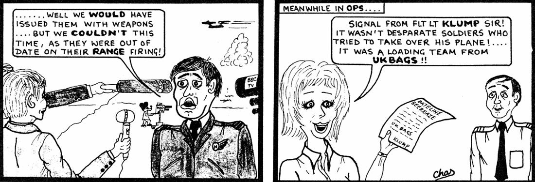 And so we took off and headed back to Brize direct. 11 hrs 5 mins. DELAY: A total of 8 to 10 days on a two day task! BACK AT LYNEHAM, FINALLY: But the story didn't end there. The morning after we got back to Lyneham we assembled in the crew room. A message came down that OC UKMAMS wanted to see me - right away - in his office. "Bloody Hell. What have I done now?" I thought.