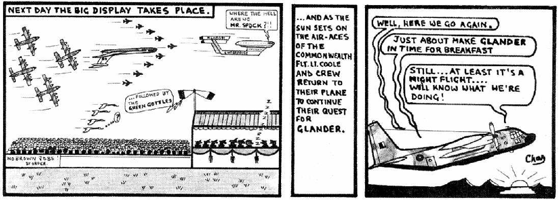 Just before lunch I got a call from my boss to tell me that our Brigadier had in turn received a call that the CO of the Parachute School wanted to see me in his office. Quick change out of my grotty old climb-under-vehicles flying suit, grab the Ferret ‘staff car’ and down to the Para School HQ. Quick word with the Adj and a raised questioning eye-brow about our de-brief earlier that morning. “The Colonel wants to see you personally” Oh Sierra Hotel India Tango what did I get wrong? Enter Colonel’s office, smart salute and remain at attention, waiting for the storm. “Ah Flight Lieutenant Bowen, I gather you had an interesting day yesterday.” “Yes Sir; it had its moments”. “Look Flight Lieutenant, on behalf of the Parachute Regiment I most sincerely apologise for the trouble you and the Station have been put to. I and my Regiment are ashamed of the whole incident, and I can advise you informally that Number (X) of 197(Y) Parachute Course has been cancelled because there are now insufficient numbers to run the course”. Wow! “Oh and I will be talking to you Commandant about how well you handled the whole thing. Now please sit down and have a cup of coffee” Wow Squared! Actually our Brigadier never formally mentioned the matter, but the next time he saw me in the Mess he just quietly said “Well done Len. Nicely handled”.