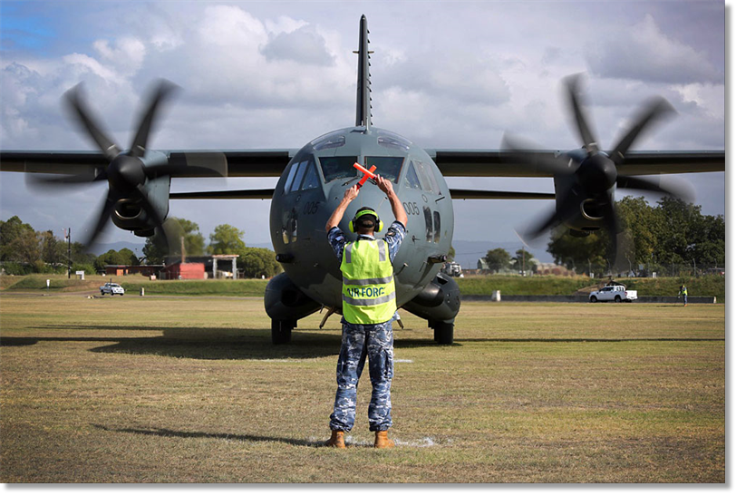 A marshaller guides a RAAF C-27J Spartan into parking position on a grass airstrip at RAAF Base Richmond. The Spartan fleet will relocate to purpose-built faciilities at RAAF Base Amberley by early 2019.