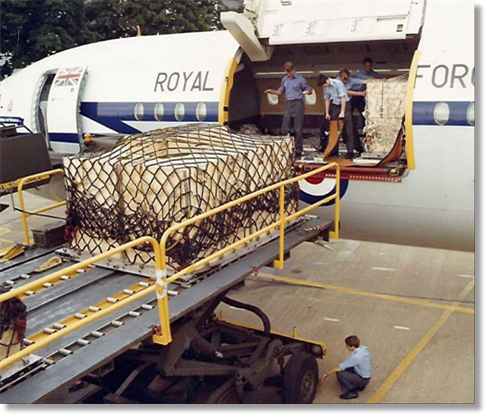 We eventually loaded the five pallets to the C130. Although no weight limits were exceeded the pallets were built to their maximum limits and so the minimum clearance inside the aircraft was realised. This left some 6 ins down the sides and some 10 inches over the top between the load and the roof in the wheel well area. Forward of the load just two side para seats could be fitted. Aft a further set were intended to be used but could not be securely anchored to the floor! This whole effort would be derailed if we did not have a sympathetic and flexible Loadmaster and Aircraft Captain willing to take the load with the highlighted limitations. That, we would know later in the day when we met them back at the airfield.