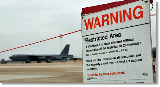 Unknown to the Captain the B52s opposite were rope fenced off and had signs in front of them stating “Use of deadly force is authorized”; this was because they were armed with nuclear weapons! A frosty silence ensued and no apology was given. Transient Alert eventually turned up with a power set and a crew bus.