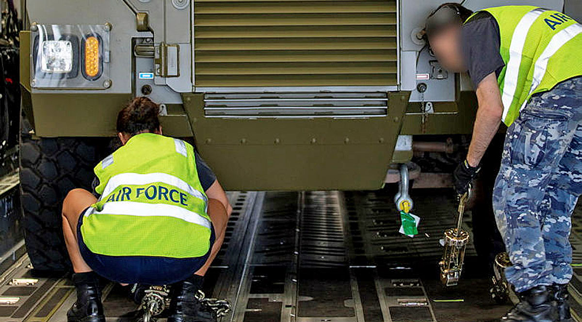 RAAF Air Movements Operators from No. 23 Squadron load M777 155mm lightweight towed howitzers bound for Ukraine onto a C-17A Globemaster III at RAAF Base Amberley in Queensland.