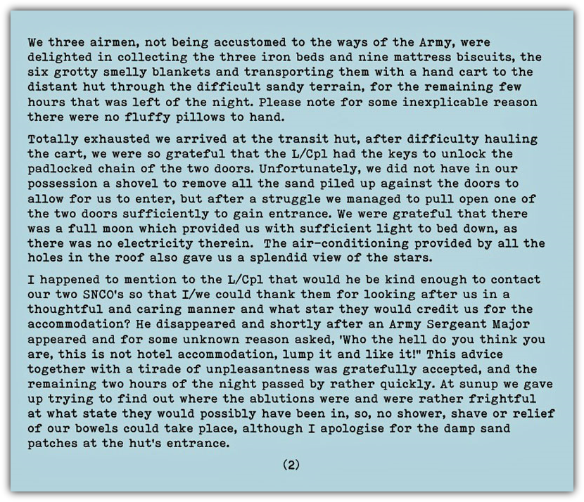 After we arrived back at Lyneham and were waiting to go through Customs, this particular Loadie got all smug about the fact that I would get charged for having too many bottles of wine since he had also has assumed I still had my bottle & '200'. I told him not to worry - he had obviously forgotten or not realised that 1/2/200 was our 'daily' DF rate and having been away 3 days, I was entitled to 9 bottles of wine! Of course, my subsequent 'wave through' customs only served to reinforce this notion and, knowing how Aircrew scuttlebut worked overtime on such issues, word quickly got around the Station, which generated another storm of protest - Happy Days winding up certain 'categories' of aircrew.