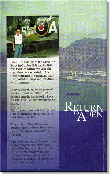 The late Peter Richards, a retired RAF engineering Warrant Officer, was writing a book, 'Return to Aden', but died before it had been completed. His two sons added the final two chapters and had the book published in 2004. It is a very comprehensive account and covers the full history of what once was a British Protectorate. I really enjoyed reading the book that turned out to be a wonderful memory-jogger. Names long forgotten came flying off the pages, reminding me of times long gone by. Anyone who has served in Aden, will, I'm sure, enjoy reading the book as much as I have.