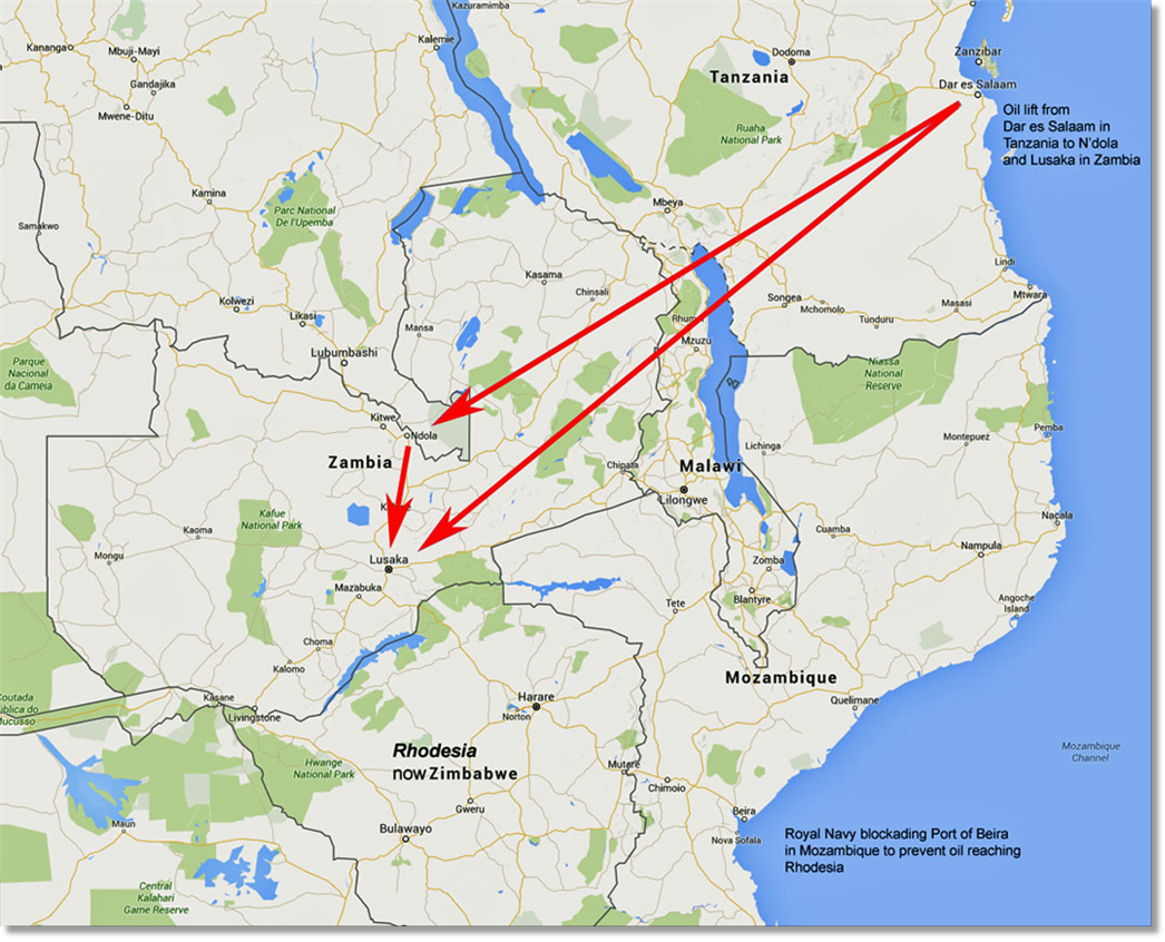 The oil lift came into being as a result of an unstable political situation on the African continent (no surprises there). Zambia is a land-locked state and is therefore dependent on the ports and facilities of neighbouring states for its imports. It was hardly the fault of the Zambian Government that Rhodesia announced its unilateral declaration of independence which annoyed the United Nations sufficiently for them to impose sanctions on Ian Smith's regime. However, part of these sanctions involved the cutting off of oil supplies to Rhodesia, and this is where the problems started for Zambia. Most of Rhodesia's oil came into the country through a pipeline that started in the Mozambique ports where the tankers delivered it having sailed down from the Persian Gulf States. The pipeline, however, didn't terminate in Rhodesia but turned north and crossed into Zambia, feeding them with oil in the same manner as their neighbour. Cutting off the Rhodesians' oil meant turning off the supplies in Mozambique and therefore effectively cutting off the Zambians who, having voted for the sanctions, got justifiably annoyed at the subsequent effect on themselves.