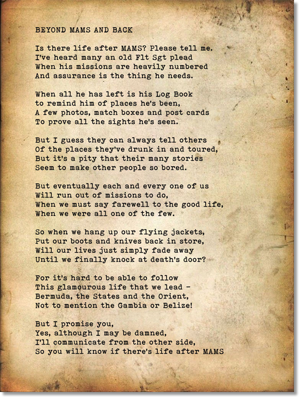 Coming back as the Sqn OC, I have it pinned on my board and intend to have it typed up and framed for the History Room. I do not know the author but it was attached to a letter sent by the spouse of a former UKMAMS member, thanking the Sqn for its support to her following her husband's death. I believe he had been long retired and it was read at his funeral.