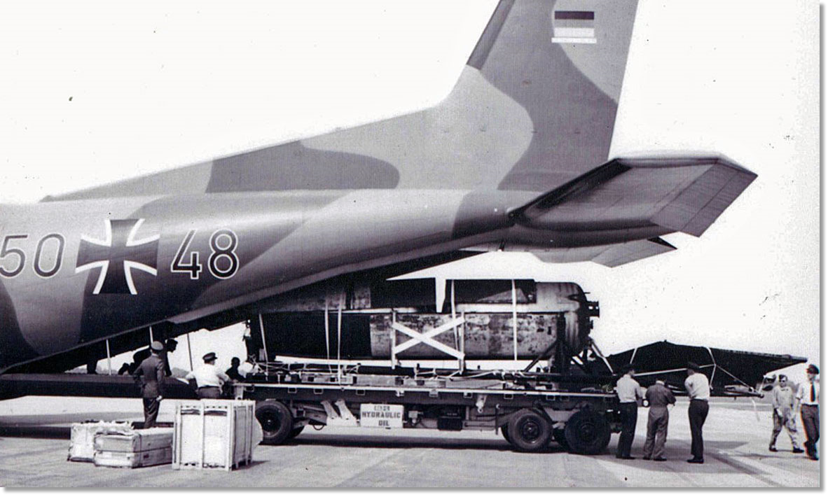 This photo is of fuel tanks from a German V2 rocket being returned to Germay in the early 1970's. A GAF C160 Transall flew into RAF Abingdon, at that time the home of UKMAMS, to collect the tanks.