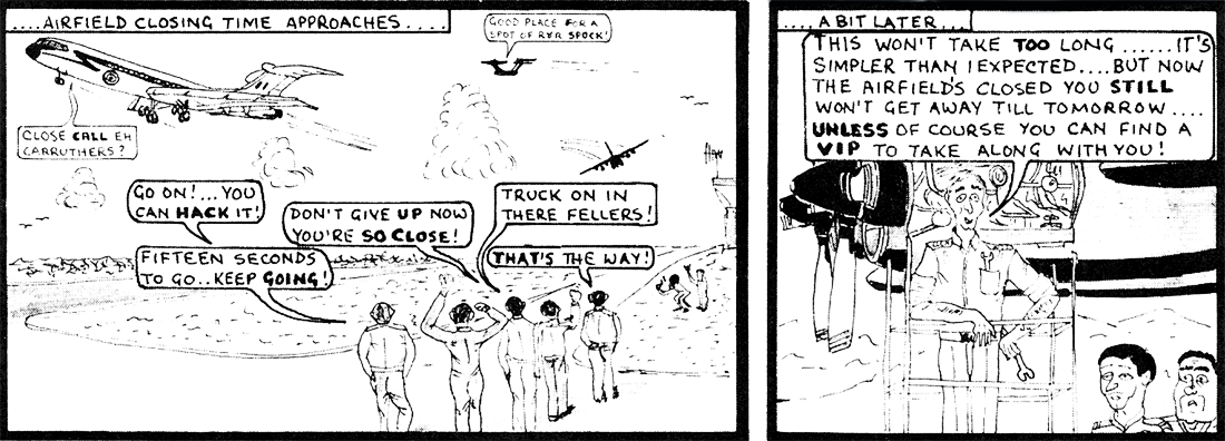 Ron Turley’s dit about Herc tipping was really interesting. I nearly had an accidental tip at Brüggen. The aircraft was heavy, but trimmed for all aspects of operation required. However, with the stool out and with the aircraft sitting on a sloping pan, downwards nose to tail, combined with the wind conditions and no crew onboard, the nose wheel was teetering. Although eager to have the aircraft closed up, ready for the crew to depart immediately on their return from the duty free run, I decided I didn’t fancy being the subject of a unit inquiry, so the ramp was lowered and the elephant's foot put back in place. All was well.