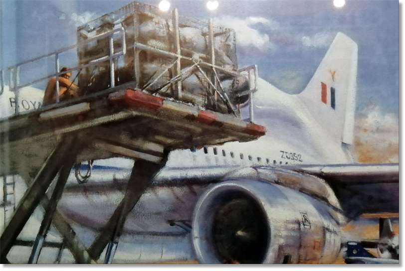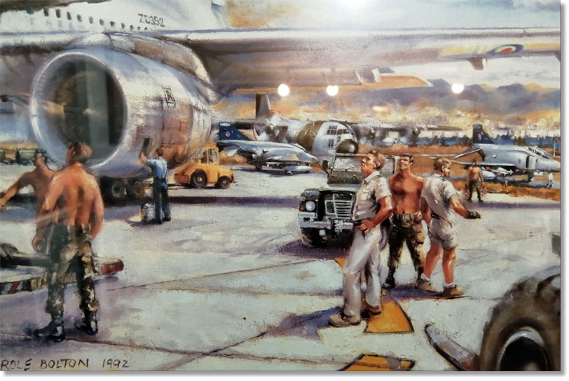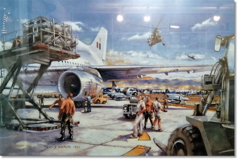 [On the following pages] I've got this picture hanging in my shop... I remember the artist, Carole Bolton sitting on a folding chair making sketches while we were outloading ammunition on Tristar KC1's, Herc's and VC10's during Op Granby in 1991. I am certain that's me fiddling around with the pallets at the top of the Treppel, (if its not me, I want to know who was playing with my machinery)....And the fact that appears to be a finely toned, bronze body, proves its me...